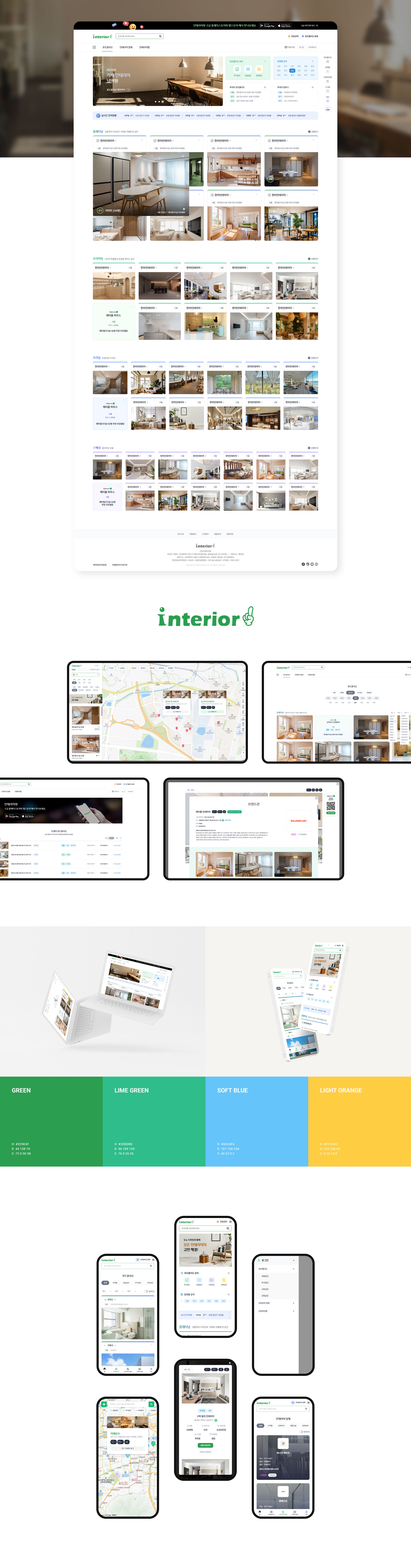 인테리어원은 인테리어 포트폴리오와 업체 매칭을 중심으로 한 콘텐츠 큐레이션형 플랫폼 디자인으로, 신뢰감·전문성·가시성을 강조한 구조가 특징입니다. 전반적으로 화이트 기반의 클린 UI에 연녹색 포인트 컬러를 사용하여, 자연스러움과 공간감을 전달하고 있습니다.