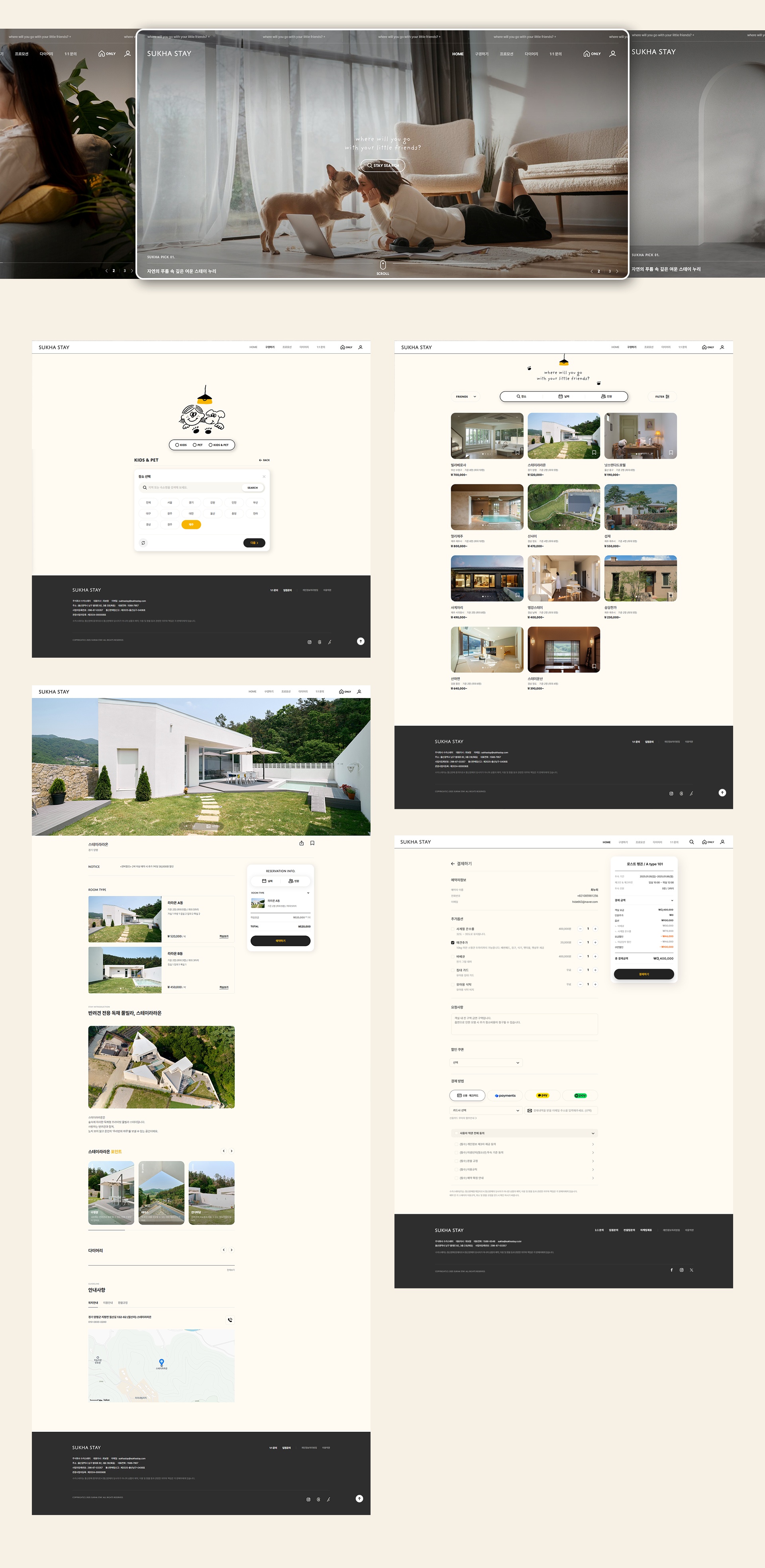 수카스테이는 반려견과 함께 할 수 있는 숙박업체을 찾을 수 있고, 예약할 수 있는 중개 플랫폼 입니다. 귀여운 디자인과 따뜻한 색감 사용으로 친근한 느낌을 주고 있으며 간결한 예약 시스템 구축으로 일반 사용자도 편안하게 예약 프로세스를 진행할 수 있도록 설계되었습니다.